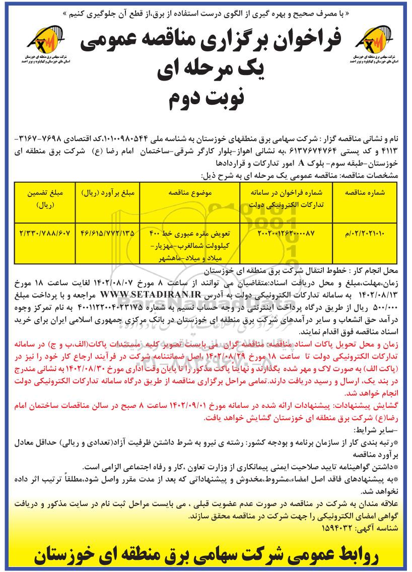 | 2021010/ 02 / م | 2002001262000087 | تعویض مقره عبوری خط 400 کیلوولت شمالغرب -مهزیار - میلاد و میلاد -ماهشهر | 46.615.772.135 | 2.330.788.607 |