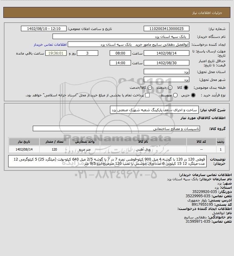 شرح کلی نیاز: ساخت و اجرای سقف پارکینگ شعبه شهرک صنعتی یزد