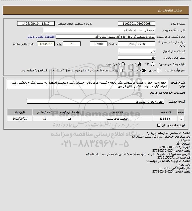 شرح کلی نیاز: جمع آوری، حمل و مبادله مرسولات دفاتر تابعه و کیسه های دفاتر روستایی(شرح پیوست)وتحویل به پست بانک و بالعکس-طبق نمونه قرارداد پیوست-تکمیل آنالیز الزامی