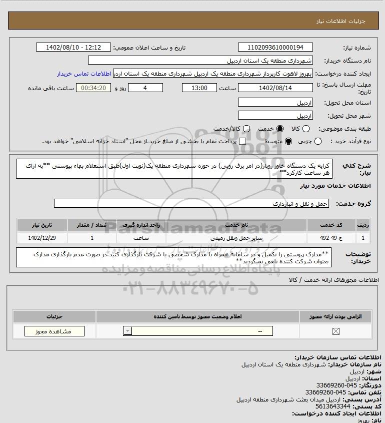 شرح کلی نیاز: کرایه یک دستگاه خاور روباز(در امر برف روبی) در حوزه شهرداری منطقه یک(نوبت اول)طبق استعلام بهاء پیوستی