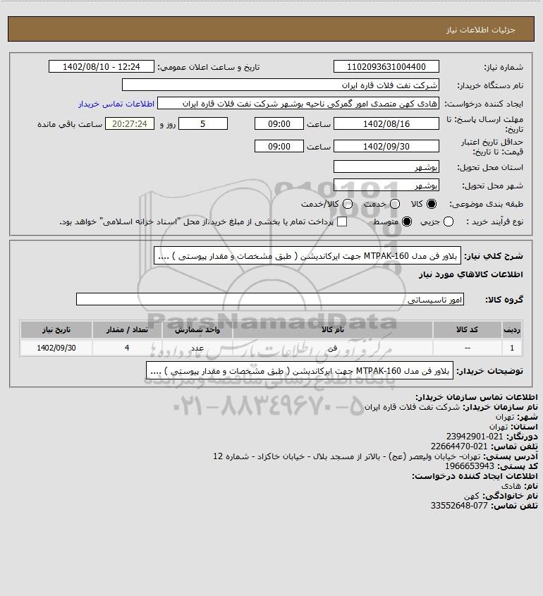 شرح کلی نیاز: بلاور فن مدل 160-MTPAK جهت ایرکاندیشن ( طبق مشخصات و مقدار پیوستی ) ....