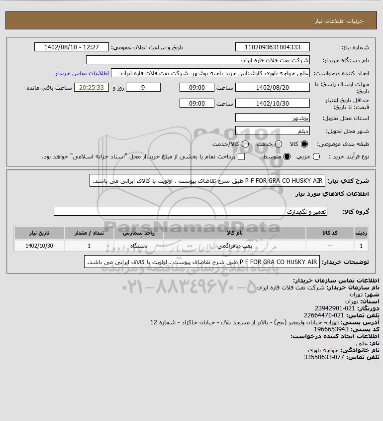 استعلام P F FOR GRA CO HUSKY AIR طبق شرح تقاضای پیوست . اولویت با کالای ایرانی می باشد., استعلام P F FOR GRA CO HUSKY AIR طبق شرح تقاضای پیوست . اولویت با کالای ایرانی می باشد.