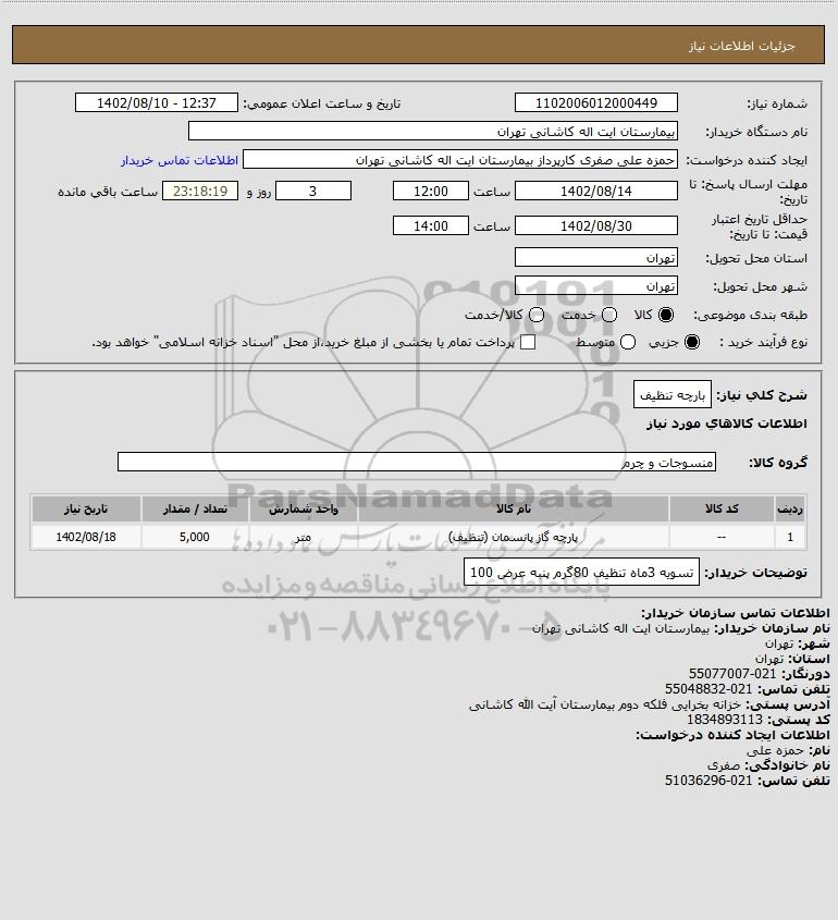 | 1 | -- | پارچه گاز پانسمان (تنظیف) | متر | 5,000 | 1402/08/18 |