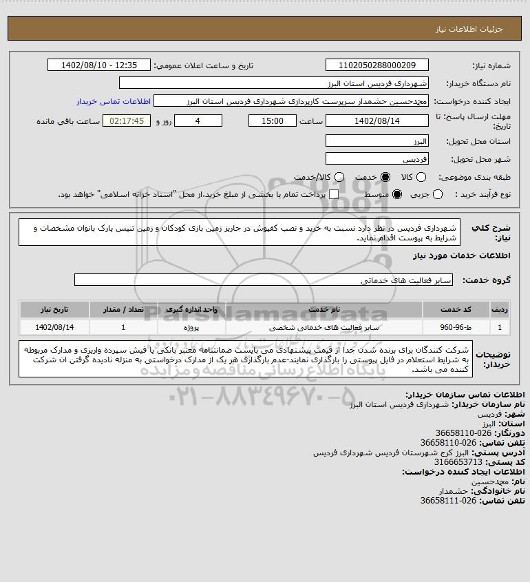 شرح کلی نیاز: شهرداری فردیس در نظر دارد نسبت به خرید و نصب کفپوش در جاریز زمین بازی کودکان و زمین تنیس پارک بانوان مشخصات و شرایط به پیوست اقدام نماید.