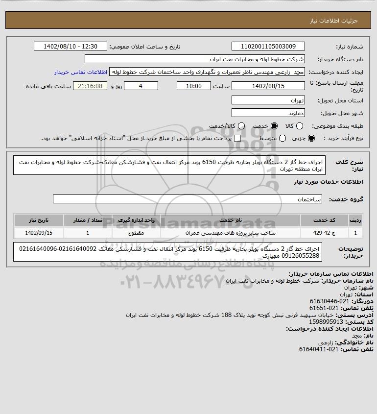 شرح کلی نیاز: اجرای خط گاز 2 دستگاه بویلر بخاربه ظرفیت 6150 پوند مرکز انتقال نفت و فشارشکن مغانک-شرکت خطوط لوله و مخابرات نفت ایران منطقه تهران