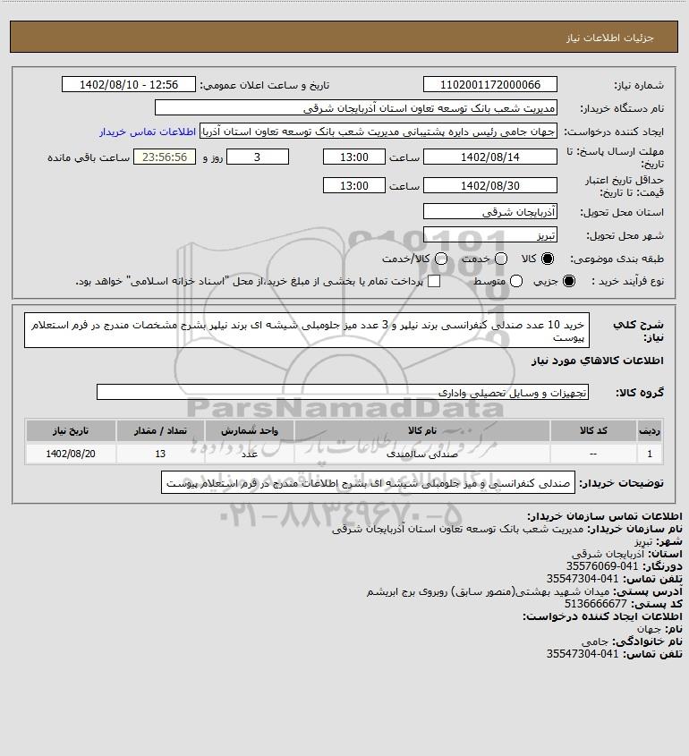 استعلام خرید 10 عدد صندلی کنفرانسی برند نیلپر و 3 عدد میز جلومبلی شیشه ای برند نیلپر بشرح مشخصات مندرج در فرم استعلام پیوست, استعلام خرید 10 عدد صندلی کنفرانسی برند نیلپر و 3 عدد میز جلومبلی شیشه ای برند نیلپر بشرح مشخصات مندرج در فرم استعلام پیوست