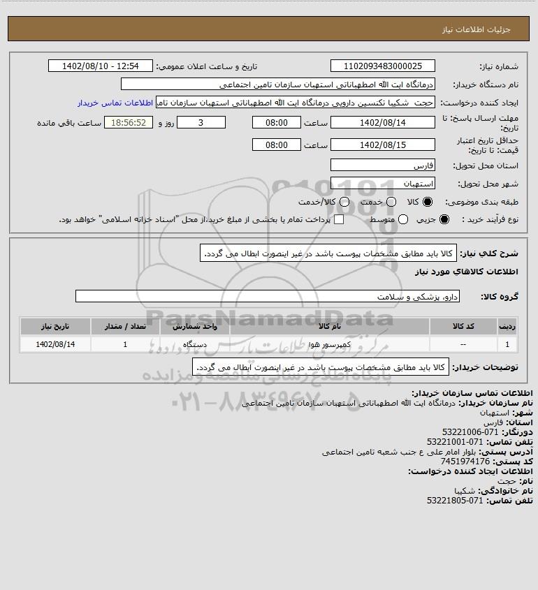 شرح کلی نیاز: کالا باید مطابق مشخصات پیوست باشد در غیر اینصورت ابطال می گردد.