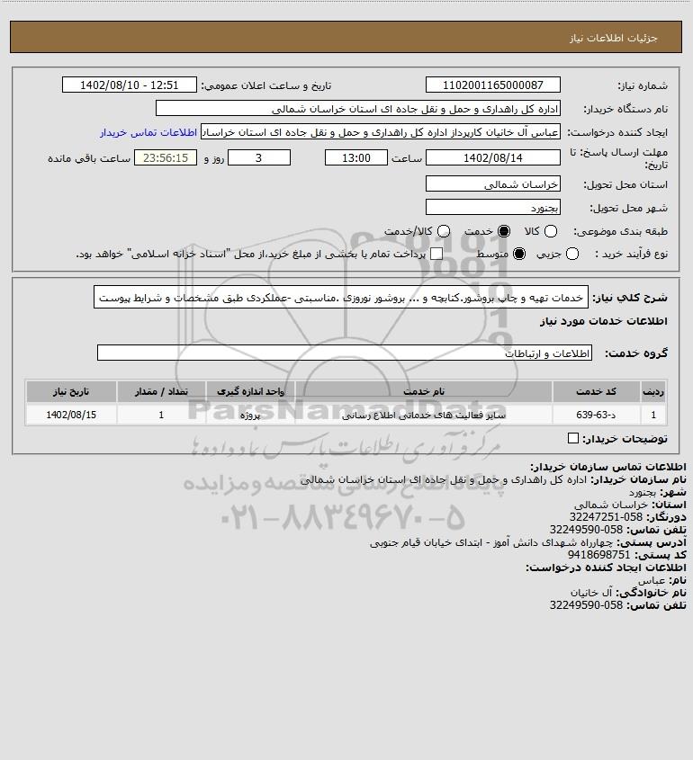 نام دستگاه خریدار:اداره کل راهداری و حمل و نقل جاده ای استان خراسان شمالی