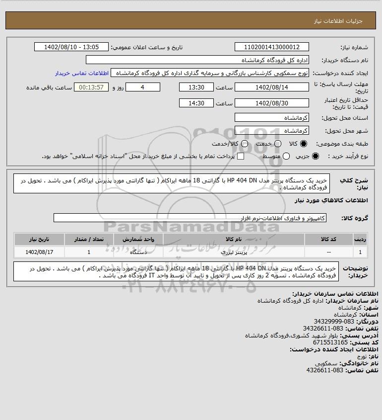 شرح کلی نیاز: خرید یک دستگاه پرینتر مدل HP 404 DN با گارانتی 18 ماهه ایراکام ( تنها گارانتی مورد پذیرش ایراکام ) می باشد . تحویل در فرودگاه کرمانشاه .
