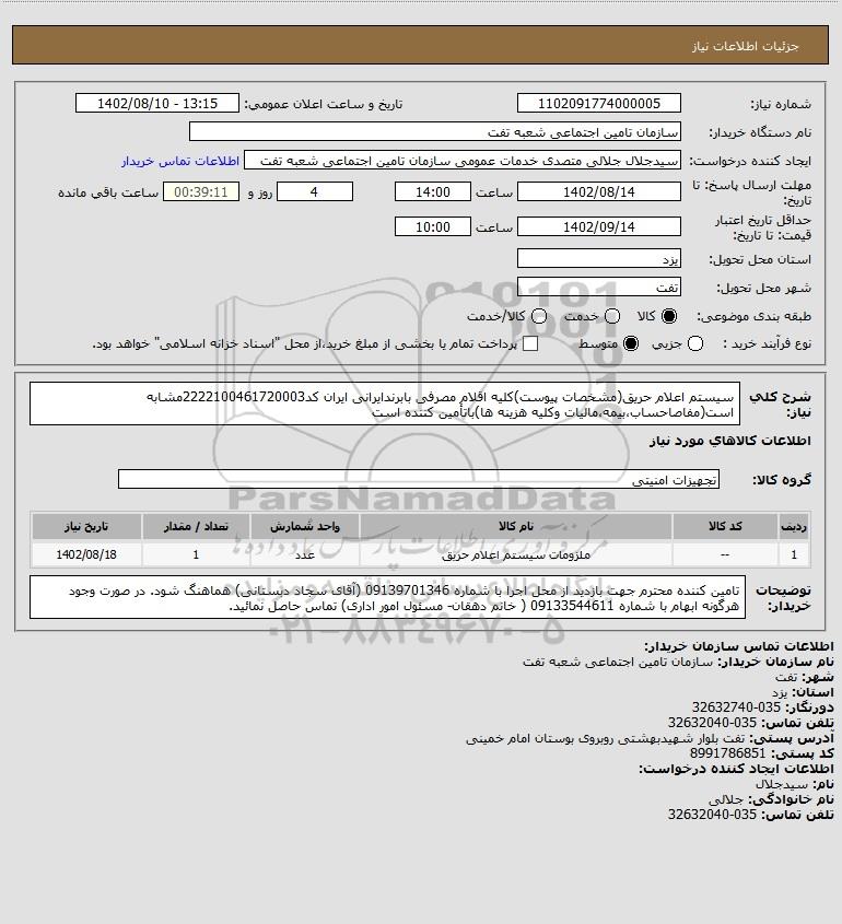 نام دستگاه خریدار:سازمان تامین اجتماعی شعبه تفت