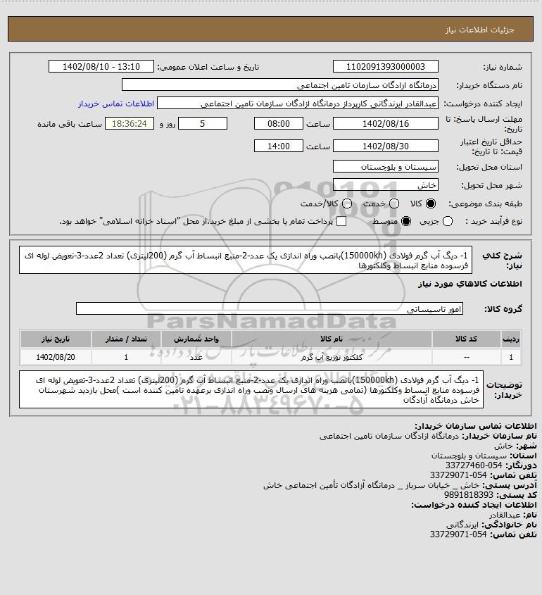 توضیحات خریدار:1- دیگ آب گرم فولادی (150000kh)بانصب وراه اندازی یک عدد-2-منبع انبساط آب گرم (200لیتری) تعداد 2عدد-3-تعویض لوله ای فرسوده منابع انبساط وکلکتورها (تمامی هزینه های ارسال ونصب وراه اندازی برعهده تامین کننده است )محل بازدید شهرستان خاش درمانگاه آزادگان