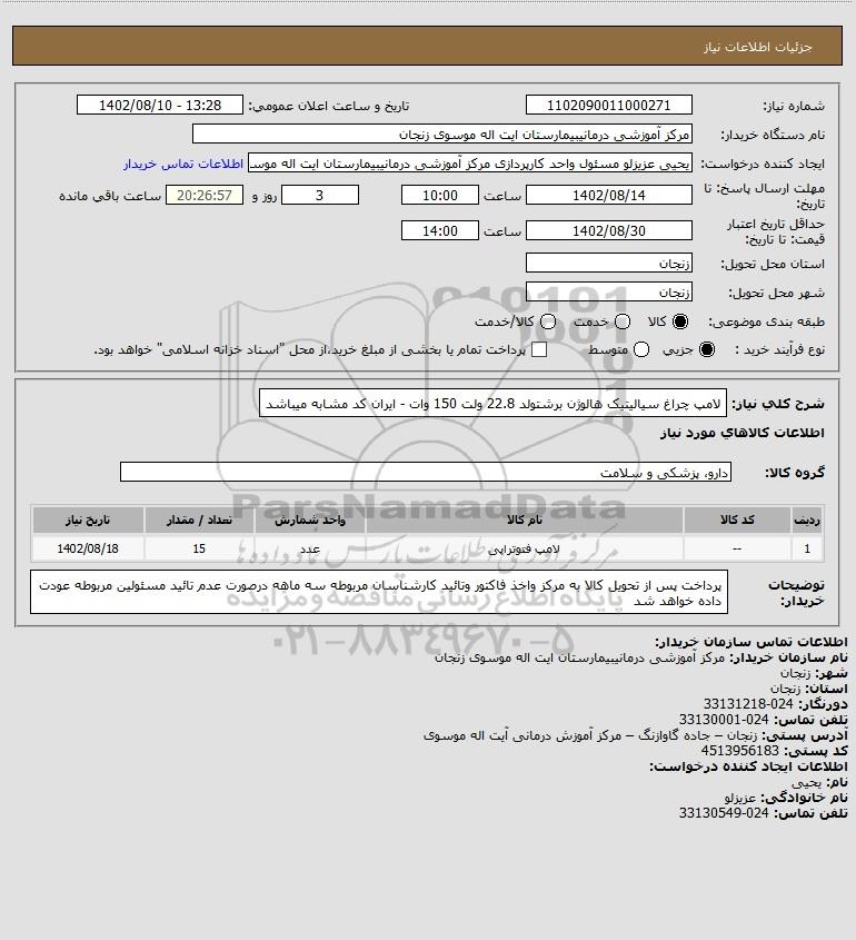 شرح کلی نیاز: لامپ چراغ سیالیتیک هالوژن برشتولد 22.8 ولت 150 وات - ایران کد مشابه میباشد