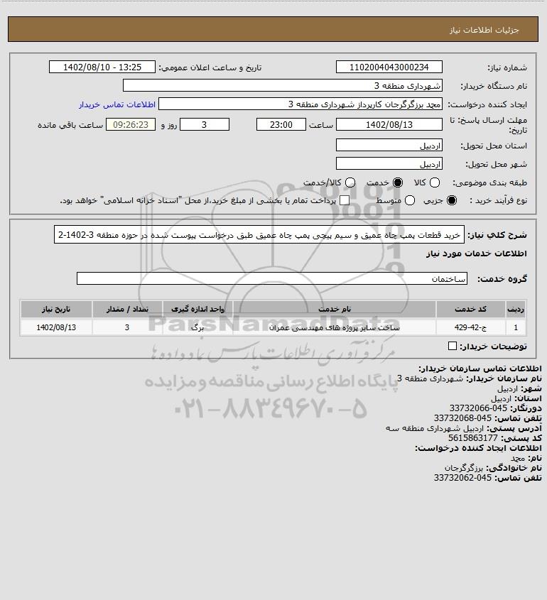 شرح کلی نیاز: خرید قطعات پمپ چاه عمیق و سیم پیچی پمپ چاه عمیق طبق درخواست پیوست شده در حوزه منطقه 3-1402-2