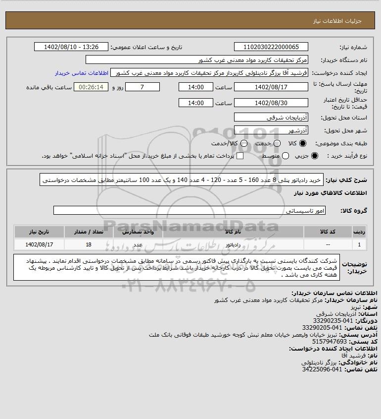 شرح کلی نیاز: خرید رادیاتور پنلی 8 عدد 160 - 5 عدد - 120 - 4 عدد 140 و یک عدد 100 سانتیمتر مطابق مشخصات درخواستی