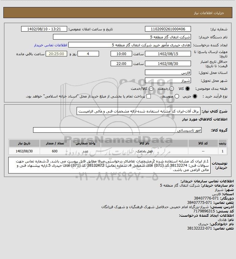 توضیحات خریدار:1.از ایران کد مشابه استفاده شده 2.مشخصات تقاضای درخواستی،صرفا مطابق فایل پیوست می باشد. 3.شماره تماس جهت سوالات فنی: 38132274 کد (071) آقای شفیعی 4. شماره تماس: 38132472 کد (071) آقای حیدری 5.ارایه پیشنهاد فنی و مالی الزامی می باشد.