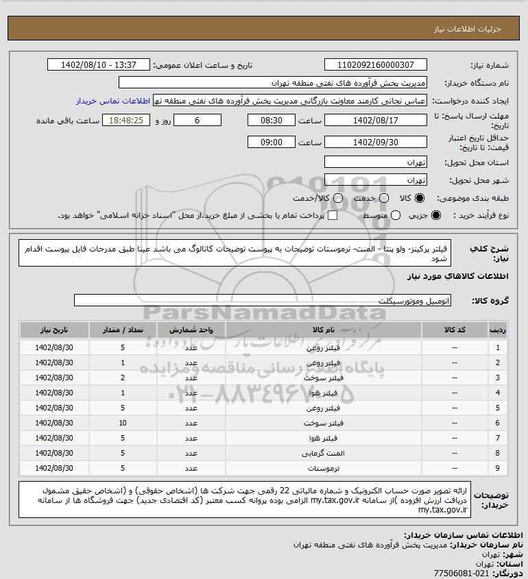 اسناد مناقصه استعلام فیلتر پرکینز- ولو پنتا - المنت- ترموستات توضیحات به پیوست توضیحات کاتالوگ می باشد عینا طبق مدرجات فایل پیوست اقدام شود به علت اتمام مهلت شرکت در مناقصه از روی وب سایت برداشته شده است. برای رویت اسناد جدید به صفحه اسناد مناقصه مزایده مراجعه کنید.
