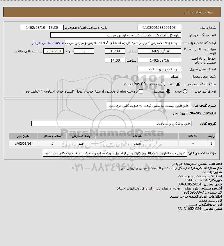 شرح کلی نیاز: دارو طبق لیست پیوستی-قیمت به صورت کلی درج شود