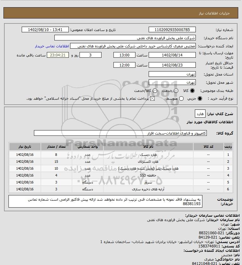 | 1 | -- | هارد دیسک | عدد | 8 | 1402/08/16 |