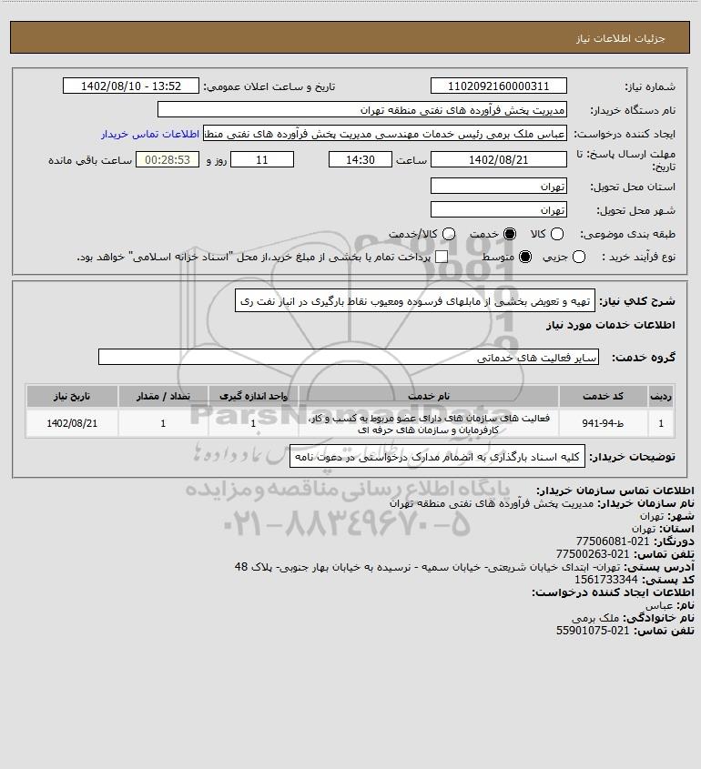 استعلام تهیه و تعویض بخشی از مابلهای فرسوده ومعیوب نقاط بارگیری در انبار نفت ری, استعلام تهیه و تعویض بخشی از مابلهای فرسوده ومعیوب نقاط بارگیری در انبار نفت ری