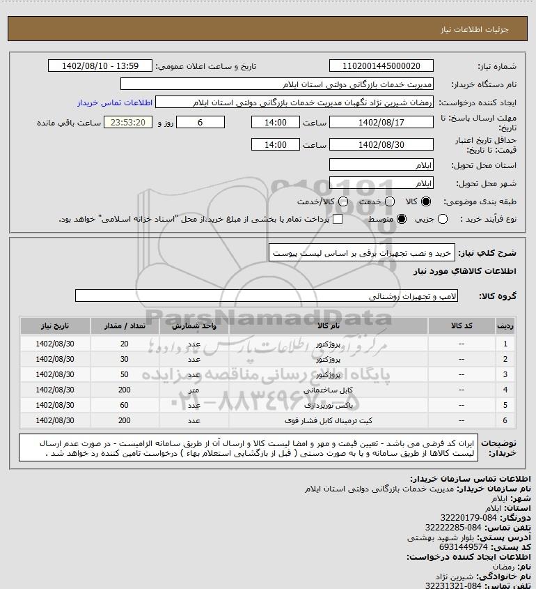 شرح کلی نیاز: خرید و نصب تجهیزات برقی بر اساس لیست پیوست