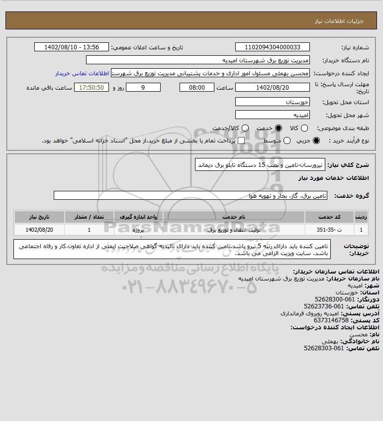 شرح کلی نیاز: نیرورسان-تامین و نصب 15 دستگاه تابلو برق دیماند