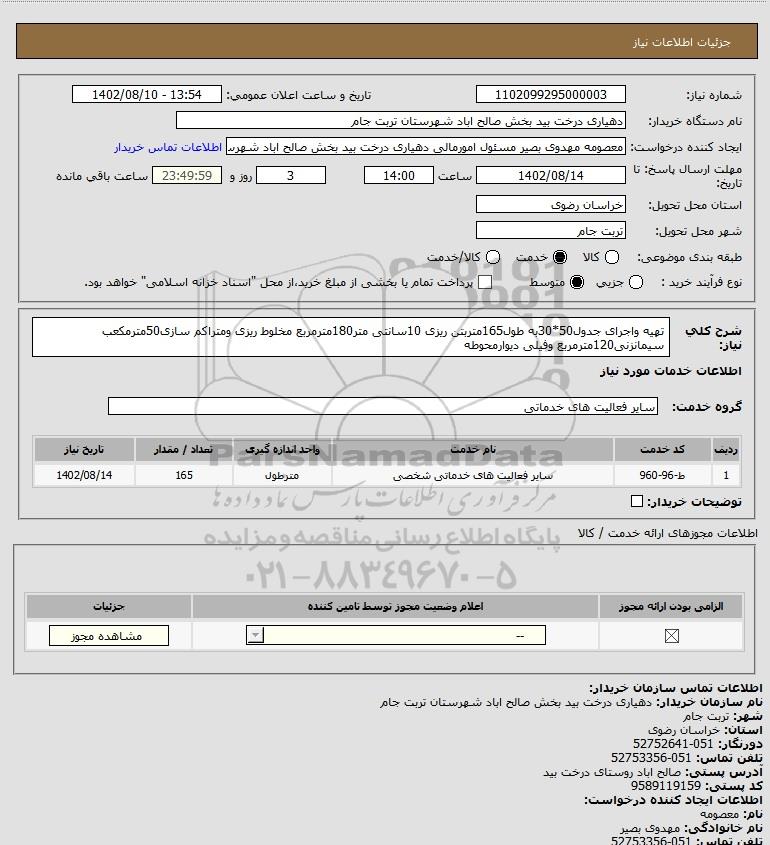 شرح کلی نیاز: تهیه واجرای جدول50*30به طول165متربتن ریزی 10سانتی متر180مترمربع مخلوط ریزی ومتراکم سازی50مترمکعب سیمانزنی120مترمربع وفیلی دیوارمحوطه