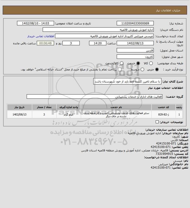 شرح کلی نیاز: با سلام تامین کننده فقط باید از خود شهرستان باشد