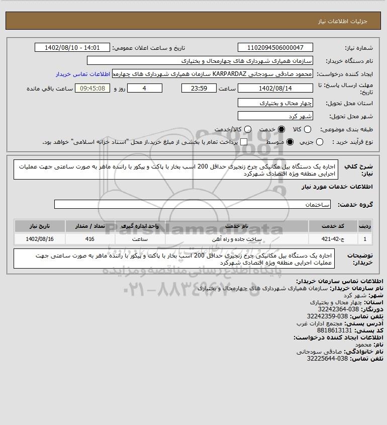 شرح کلی نیاز: اجاره یک دستگاه بیل مکانیکی چرخ زنجیری حداقل 200 اسب بخار با پاکت و پیکور با راننده ماهر به صورت ساعتی جهت عملیات اجرایی منطقه ویژه اقتصادی شهرکرد