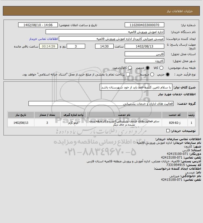 شرح کلی نیاز: با سلام تامین کننده فقط باید از خود شهرستان باشد