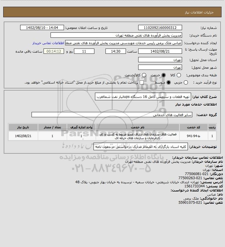 شرح کلی نیاز: تهیه قطعات و سرویس کامل 16 دستگاه upsانبار نفت شمالغرب