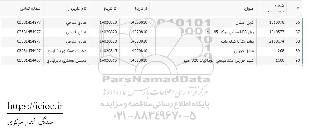 | 1100 | کلید حرارتی مغناطیسی اتوماتیک 320 آمپر | 1402.8.15 | محسن عسکری باقرآبادی | 03531454467 |