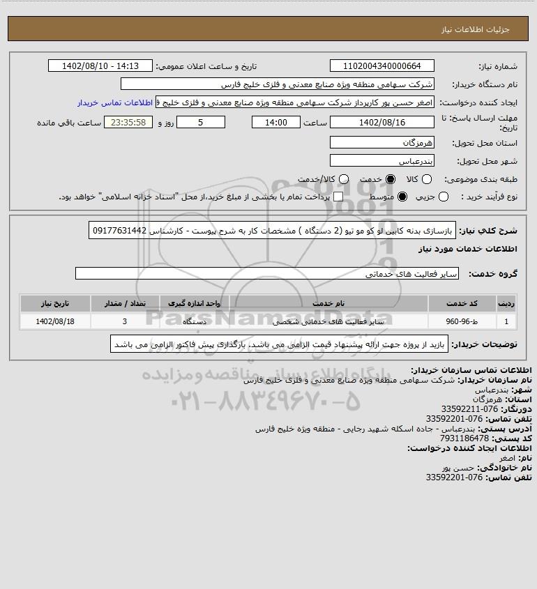 شرح کلی نیاز: بازسازی بدنه کابین لو کو مو تیو (2 دستگاه ) مشخصات کار به شرح پیوست - کارشناس 09177631442