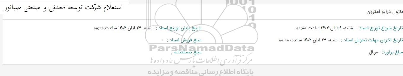 تاریخ آخرین مهلت تحویل اسناد: شنبه 13 ابان 1402 ساعت 00.00