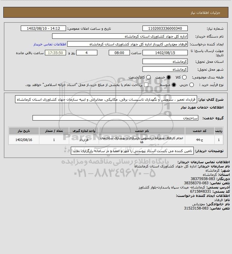 استعلام قرارداد تعمیر ، سرویس و نگهداری تاسیسات برقی، مکانیکی، مخابراتی و ابنیه سازمان جهاد کشاورزی استان کرمانشاه, استعلام قرارداد تعمیر ، سرویس و نگهداری تاسیسات برقی، مکانیکی، مخابراتی و ابنیه سازمان جهاد کشاورزی استان کرمانشاه