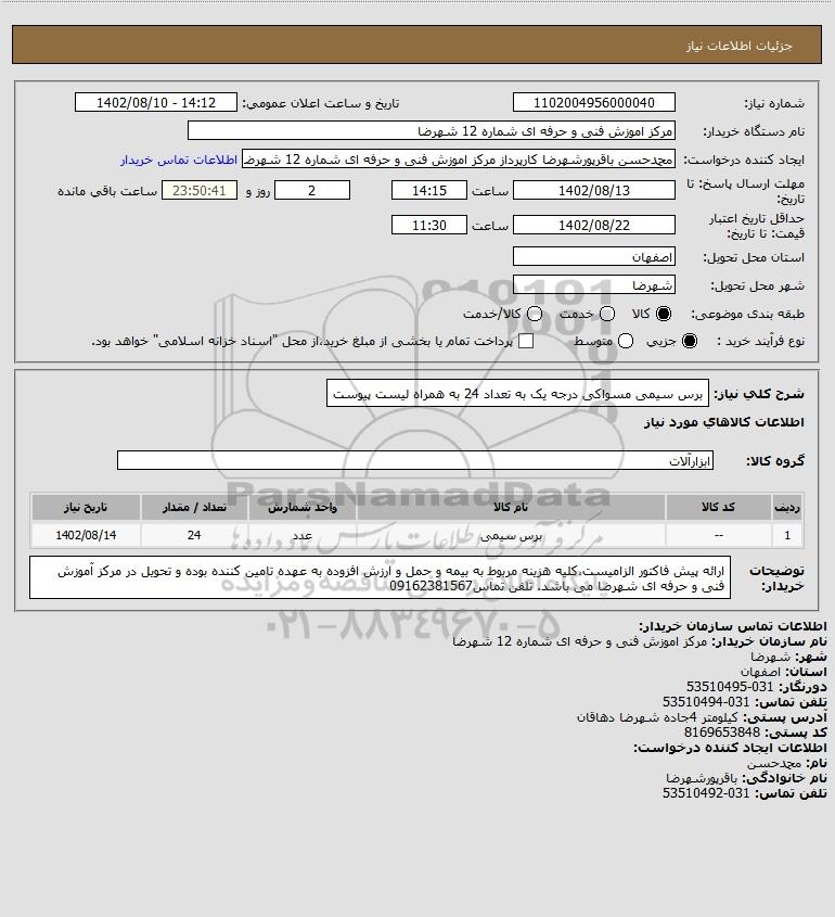 نام دستگاه خریدار:مرکز اموزش فنی و حرفه ای شماره 12 شهرضا