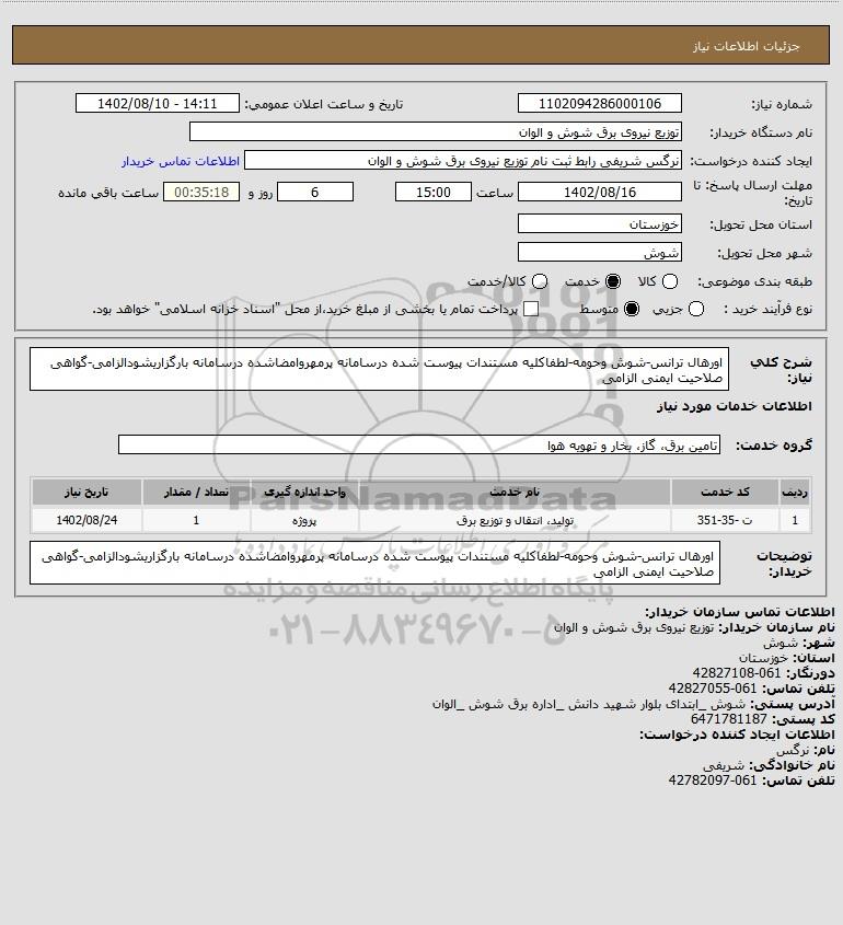 شرح کلی نیاز: اورهال ترانس-شوش وحومه-لطفاکلیه مستندات پیوست شده درسامانه پرمهروامضاشده درسامانه بارگزاریشودالزامی-گواهی صلاحیت ایمنی الزامی