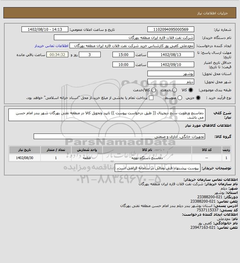 | 1 | -- | دماسنج دستگاه تهویه | قطعه | 1 | 1402/08/30 |