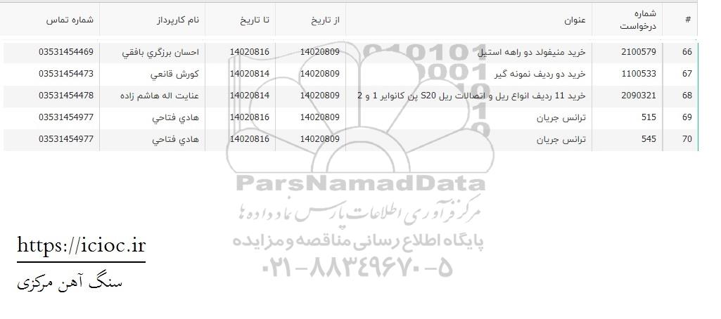| 2090321 | خرید 11 ردیف انواع ریل و اتصالات ریل s20 پن کانوایر 1 و 2 | 1402.8.9 | 1402.8.14 | عنایت اله هاشم زاده | 03531454478 |