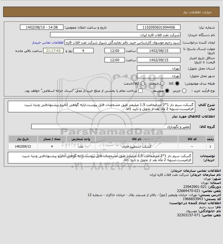 شرح کلی نیاز: گسکت سیم دار 1*2 مترضخامت 1.5 میلیمتر طبق مشخصات فایل پیوست.ارایه گواهی آنالیزو پیشنهادفنی ودیتا شیت الزامیست.تسویه 2 ماه بعد از تحویل و تایید کالا.