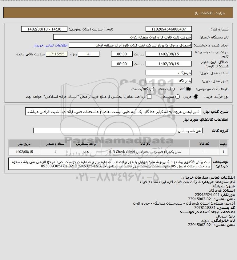 شرح کلی نیاز: شیر ایمنی مربوط به اسکرابر خط گاز- یک آیتم طبق لیست تقاضا و مشخصات فنی، ارائه دیتا شیت الزامی میباشد