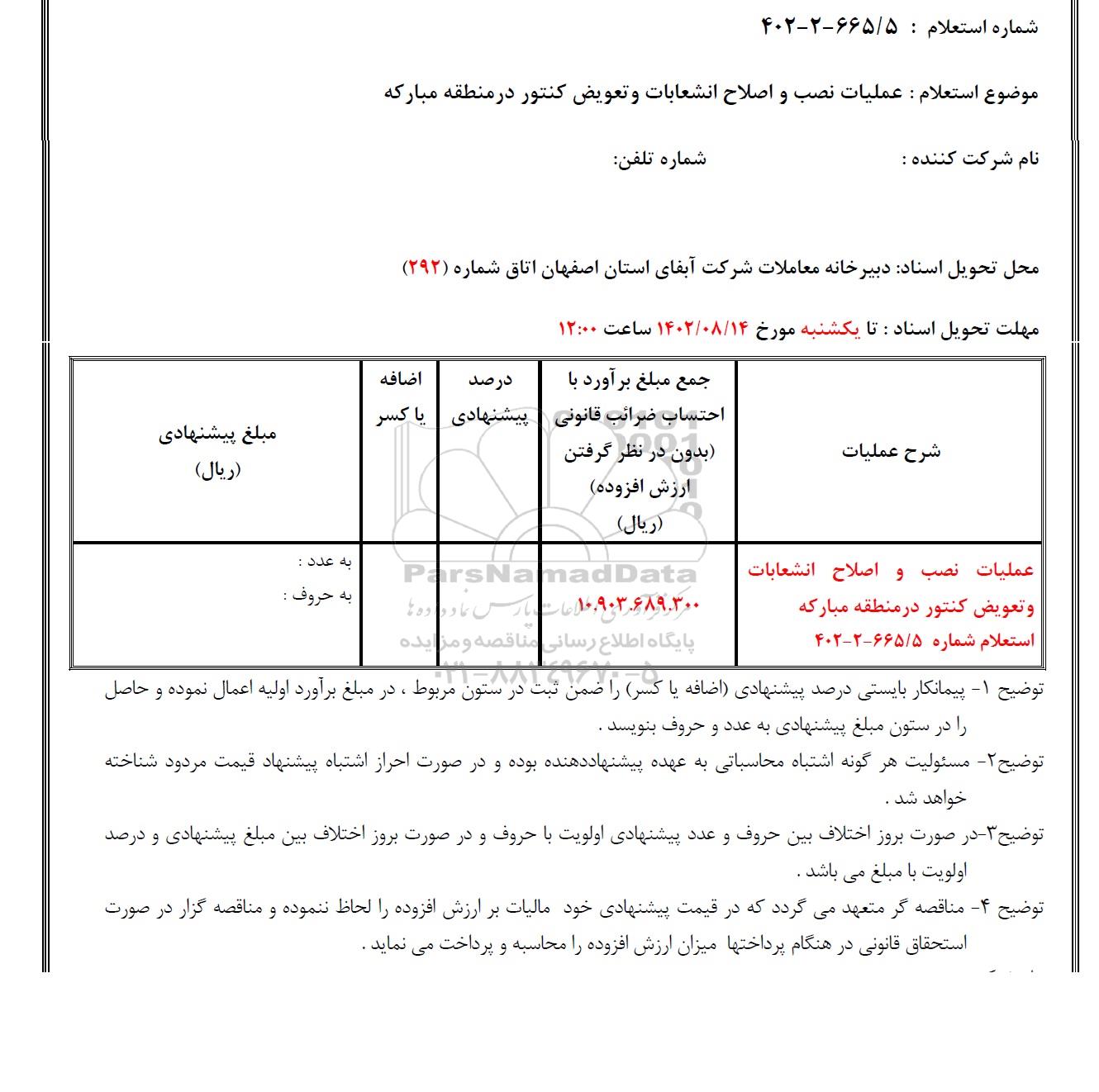 | عملیات نصب و اصلاح انشعابات و تعویض کنتور در منطقه مبارکه استعلام شماره 5/ 665 - 2 - 402 |