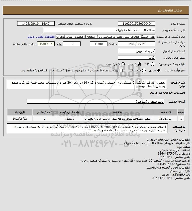 شرح کلی نیاز: تعمیر و رفع گیر مکانیکی 2 دستگاه تاور روشنایی (شماره 13 و 14) با ارتفاع 30 متر در تاسیسات تقویت فشار گاز تکاب منظم به شرح خدمات پیوست