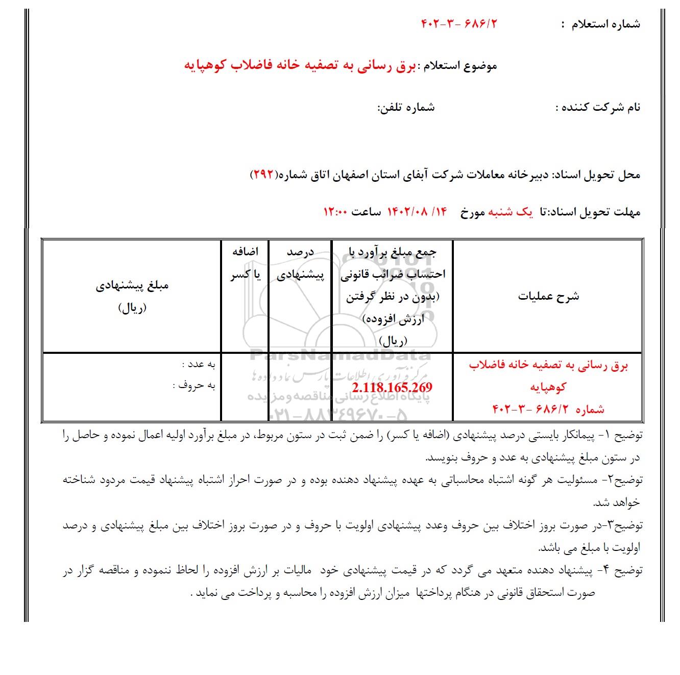 موضوع استعلام: برق رسانی به تصفیه خانه فاضلاب کوهپایه