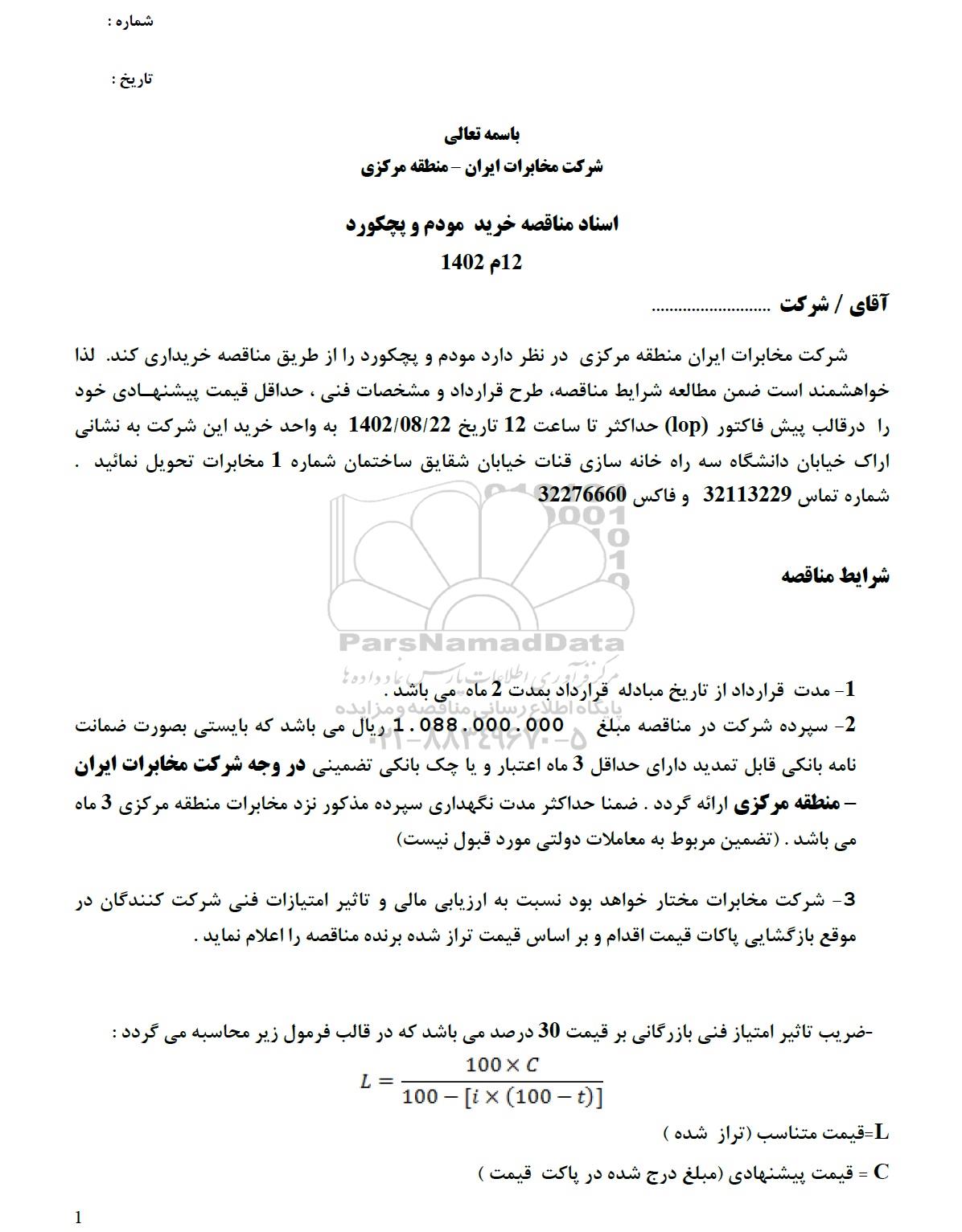 شرکت مخابرات ایران - منطقه مرکزی در نظر دارد مودم و پچکورد را از طریق مناقصه عمومی خریداری نماید. لذا خواهشمند است ضمن مطالعه شرایط مناقصه طرح قرارداد و مشخصات فنی حداقل قیمت پیشنهادی خود را در قالب پیش فاکتور lop حداکثر تا ساعت 12 تاریخ 1402.8.22 به واحد خرید این شرکت به نشانی اراک خیابان دانشگاه سه راه خانه سازی قنات خیابان شقایق ساختمان شماره 1 مخارات تحویل نمایند