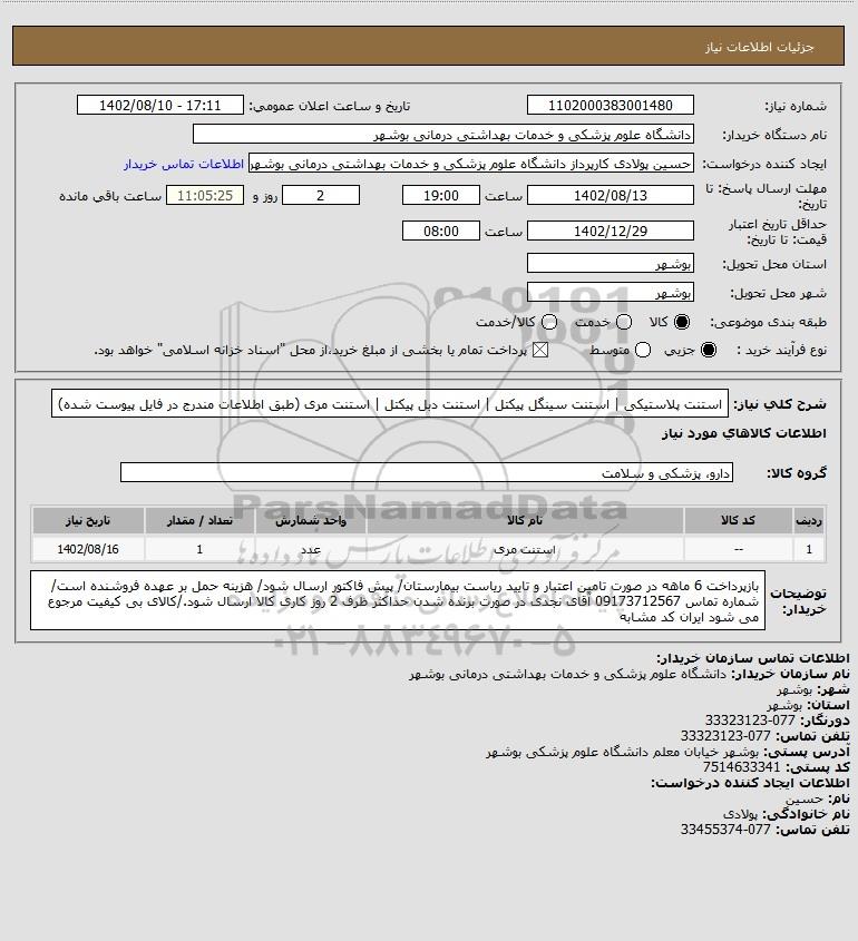 شرح کلی نیاز: استنت پلاستیکی | استنت سینگل پیکتل | استنت دبل پیکتل | استنت مری (طبق اطلاعات مندرج در فایل پیوست شده)
