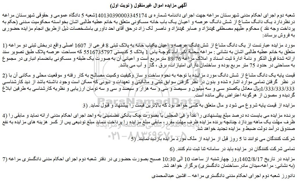 شعبه دوم اجرای احکام مدنی شهرستان مراغه جهت اجرای دادنامه شماره ی 140130390003345174شعبه 5 دادگاه عمومی و حقوقی شهرستان مراغه درنظردارد یک دانگ مشاع از شش دانگ عرصه و اعیان یک باب خانه مسکونی متعلق به خانم عطیه طالبی اشان بخواسته محکومیت مدنی (حکم به پرداخت وجه نقد ) محکوم علیهم مصطفی محمدنژاد و صابر محمدنژاد و ناصر لک زاد درحق آقای احد داوری بامشخصات ذیل ازطریق انجام مزایده حضوری به فروش برساند: