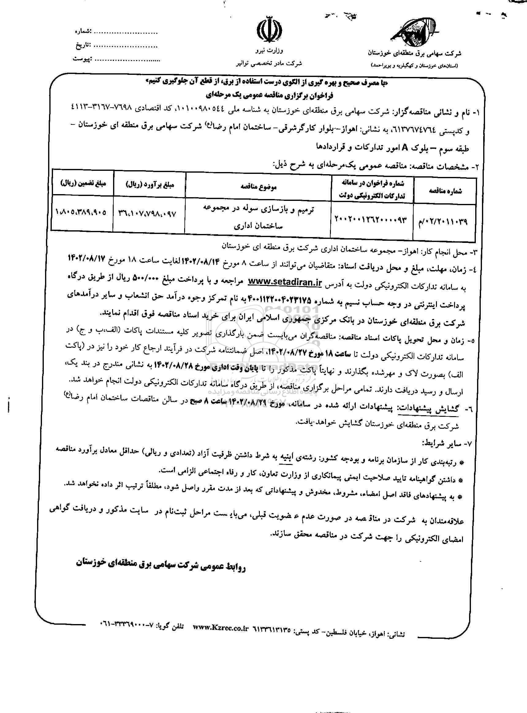 گشایش پیشنهادات پیشنهاد : پیشنهادات ارائه شده در سامانه مورخ 1402.8.29 ساعت 8 صبح در سالن مناقصات ساختمان امام رضا ع شرکت برق منطقه ای خوزستان گشایش خواهد یافت
