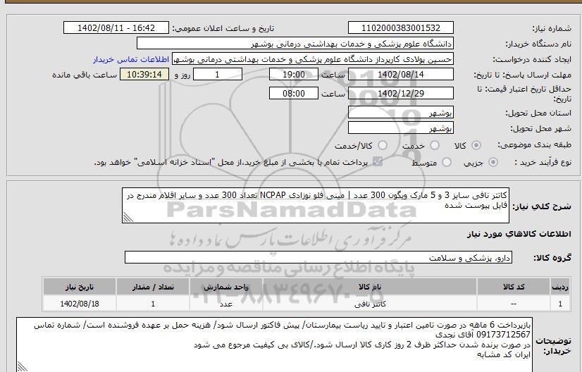 شرح کلی نیاز: کاتتر نافی سایز 3 و 5 مارک ویگون 300 عدد | مینی فلو نوزادی NCPAP تعداد 300 عدد و سایر اقلام مندرج در فایل پیوست شده