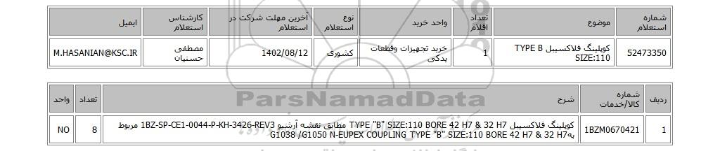 52473350کوپلینگ فلاکسیبل TYPE B SIZE:110 1خرید تجهیزات وقطعات یدکیکشوری1402/08/12مصطفی حسنیانM.HASANIAN@KSC.IR