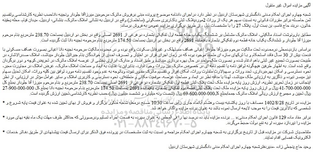 شعبه چهارم اجرای احکام مدنی دادگستری شهرستان اردبیل در نظر دارد دراجرای دادنامه موضوع پرونده مبنی برفروش ماترک مرحومین میرزاآقا جلودار ونجیبه داناحسب نظریه کارشناسی وتقسیم ثمن حاصله برابر مقررات قانونی به نسبت سهم هر یک از وراث 2موردپلاک ثبتی باکاربری مسکونی (ساختمان) واقع در اردبیل به نشانی املاک ماترک، بنشانی؛ اردبیل، میدان قیام، محله یعقینه خاتون، دربند حاج قاسم، بن بست اول، پلاک 27 را با مشخصات ذیل ، از طریق برگزاری مزایده عمومی به فروش برساند: